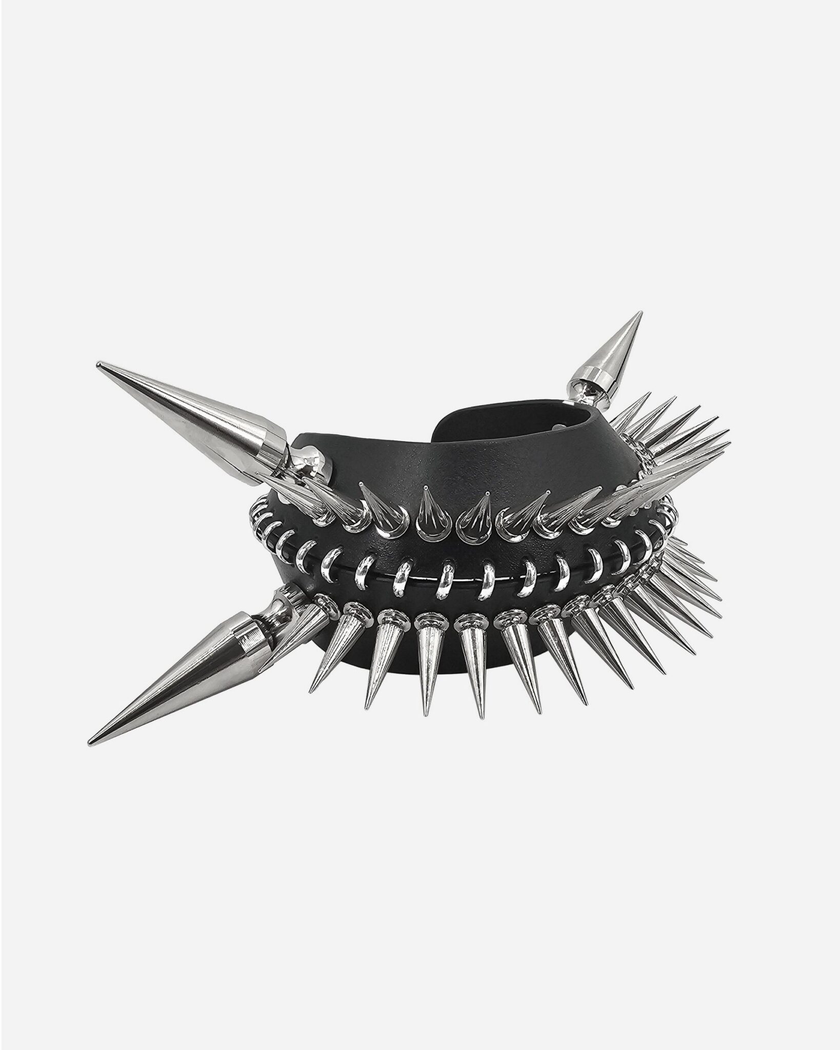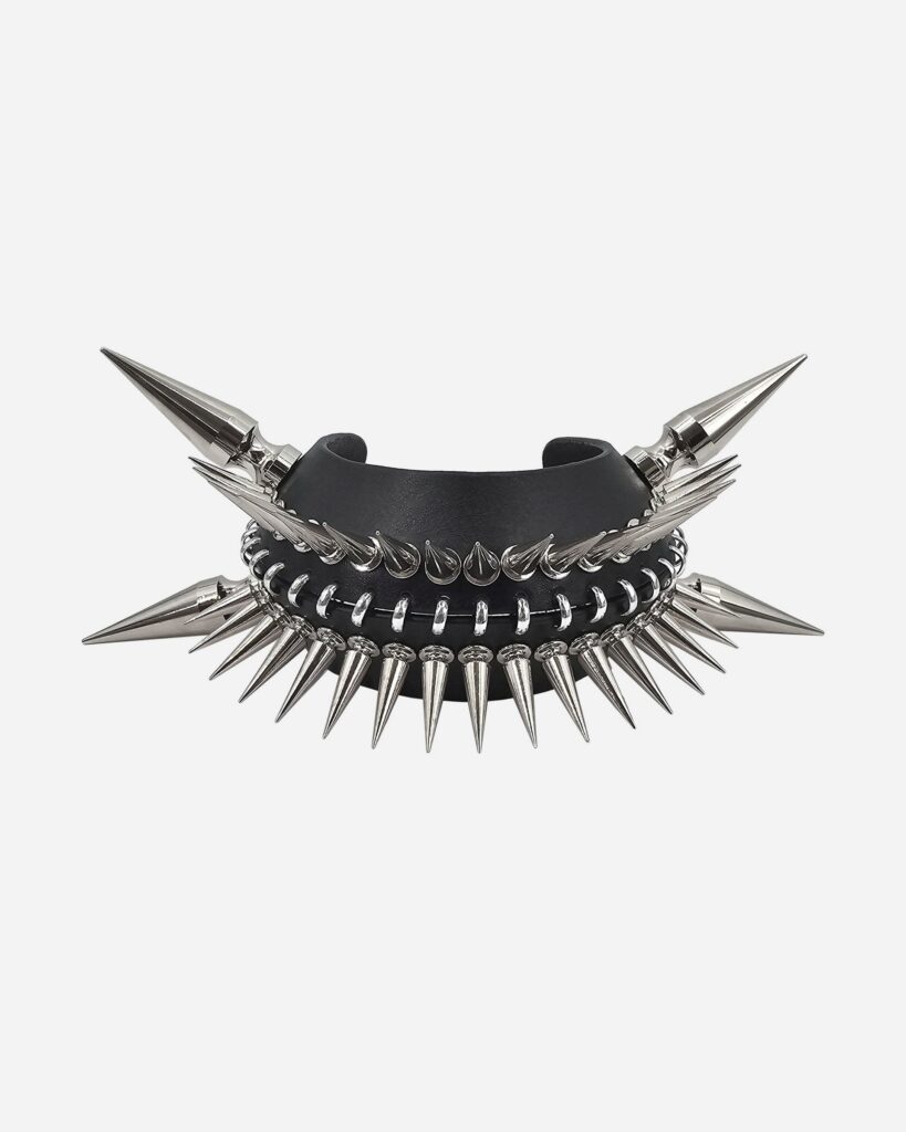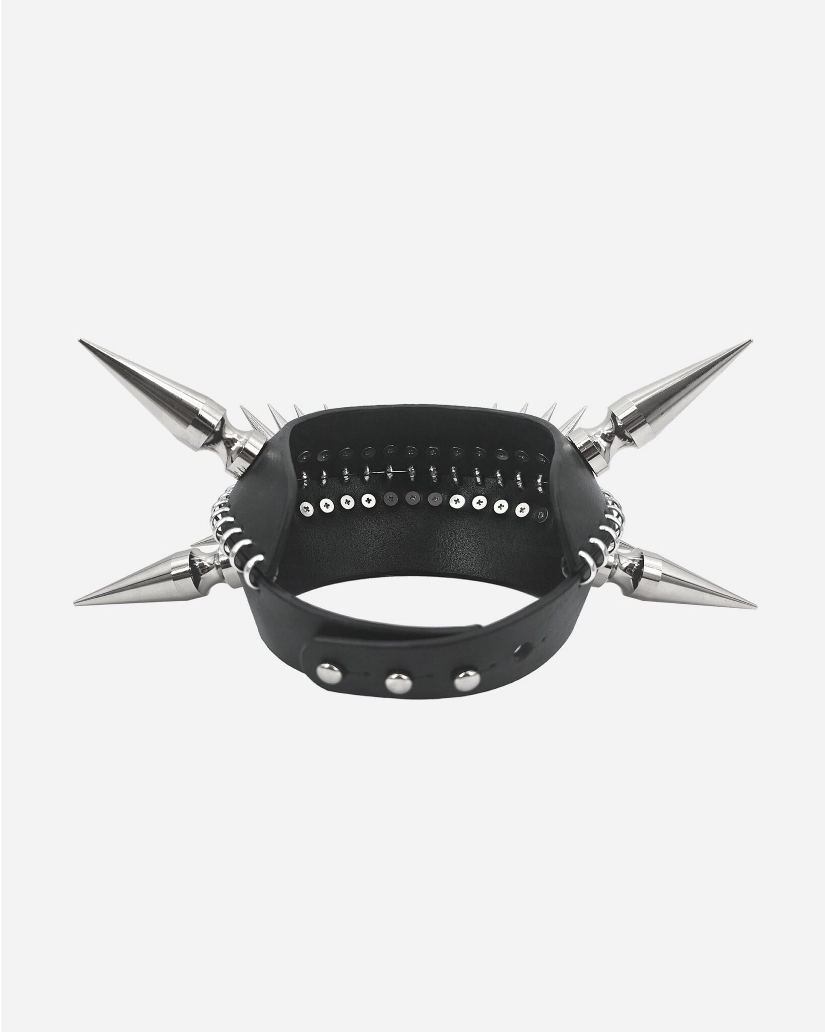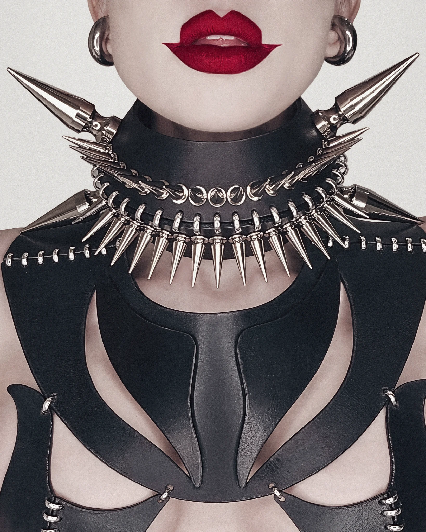 A pioneering three-dimensional, signature collar adorned with bold metal spikes and signature metal stitching. Inspired by the mythic herald whose voice could rival fifty men, this groundbreaking piece embodies commanding presence and unyielding strength.