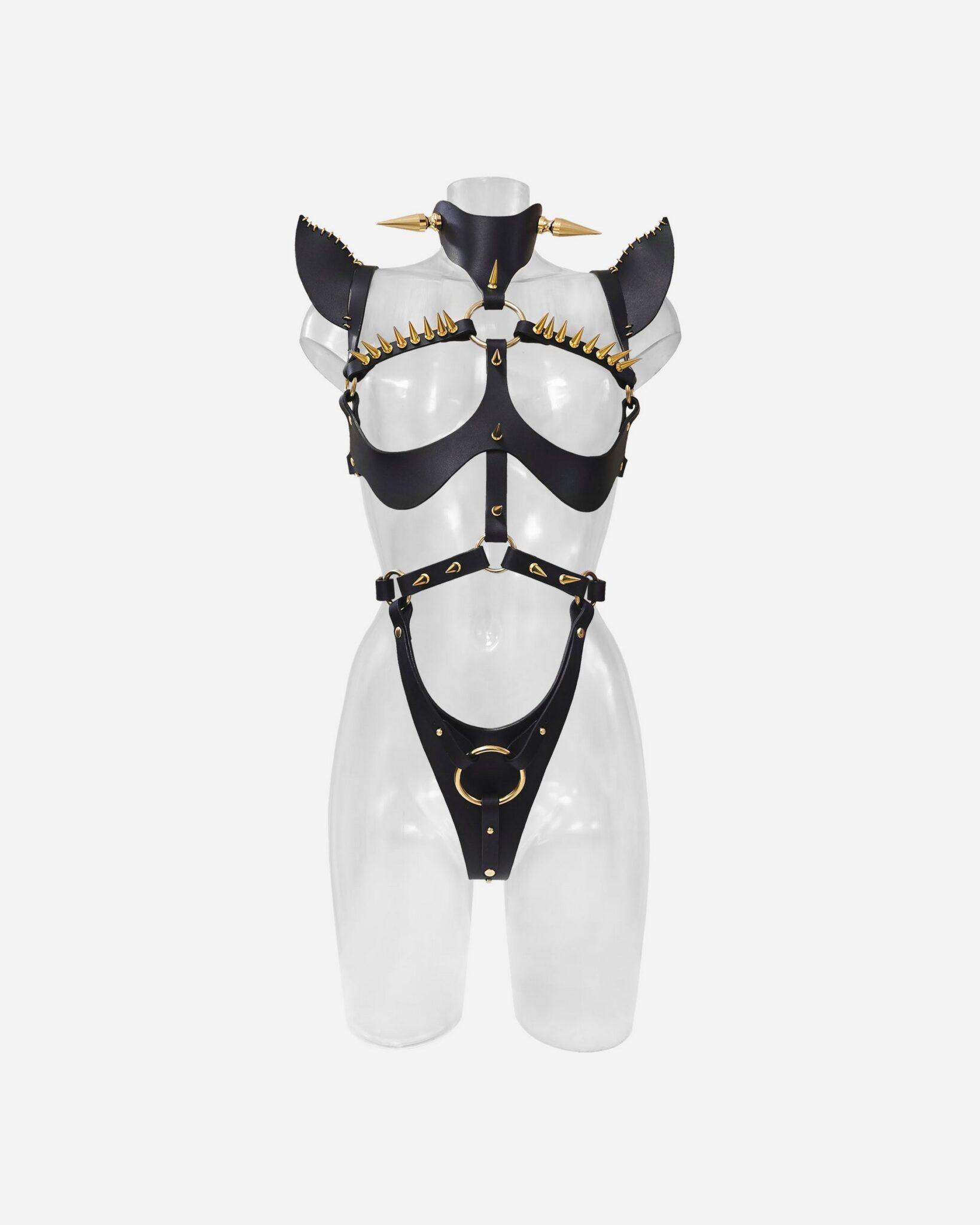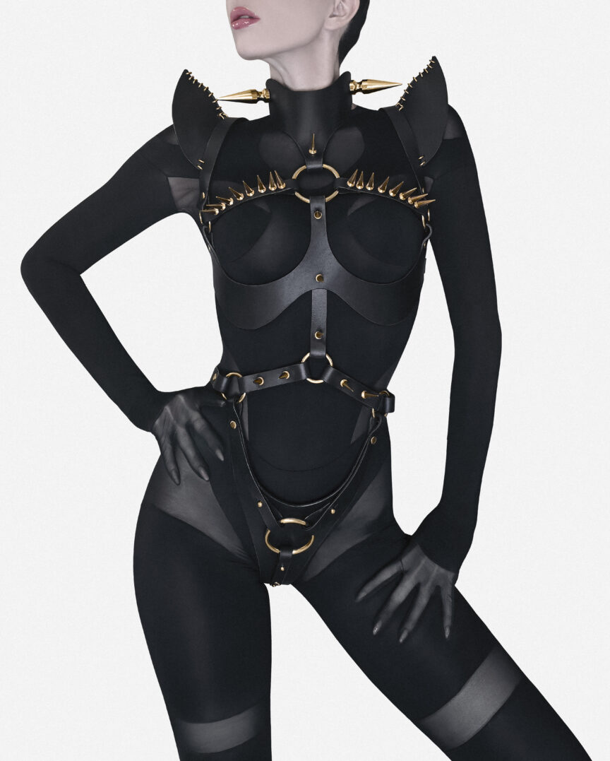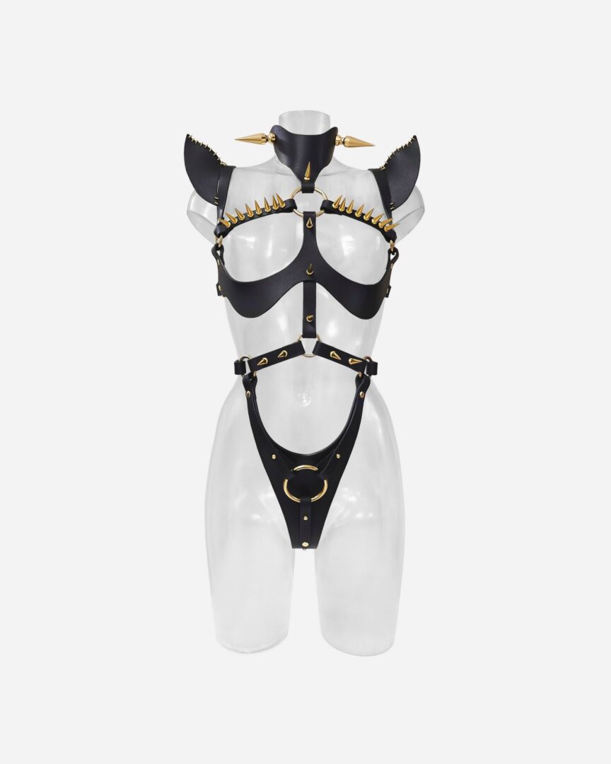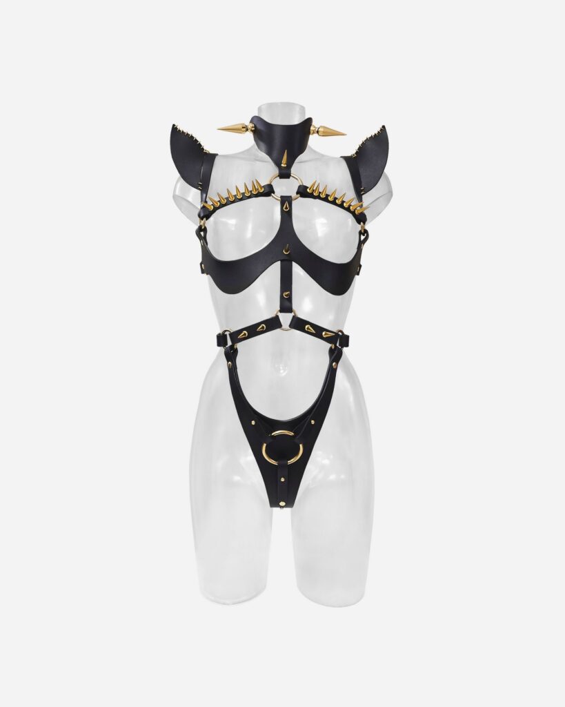 Crafted from luxuriously tough, premium leather and adorned with our signature metal stitching, this piece features bold, sculpted shoulders, savage spikes, and the infamous crotch hoop that says exactly what it means. Every detail is a labor of dark love, engineered for the woman who wants her power worn like armor.