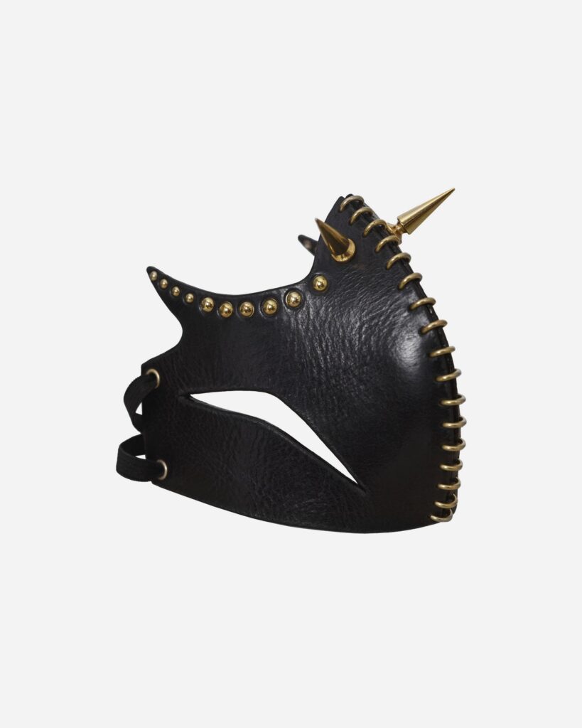 A mask for the villain who prefers poetry with a punch. Crafted from premium full-grain leather, adorned with unapologetic spikes, bold organic cuts, and our signature metal stitching, Dvora doesn’t whisper threats—it declares them.