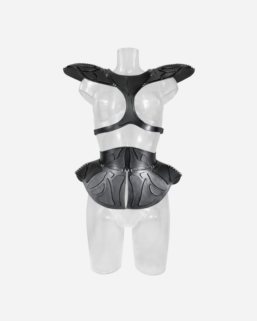 Born from a distant void, forged to command attention. This leather set channels the power of a ruthless alien queen with bold three-dimensional forms and strong shoulder details. Otherworldly. Unstoppable.
