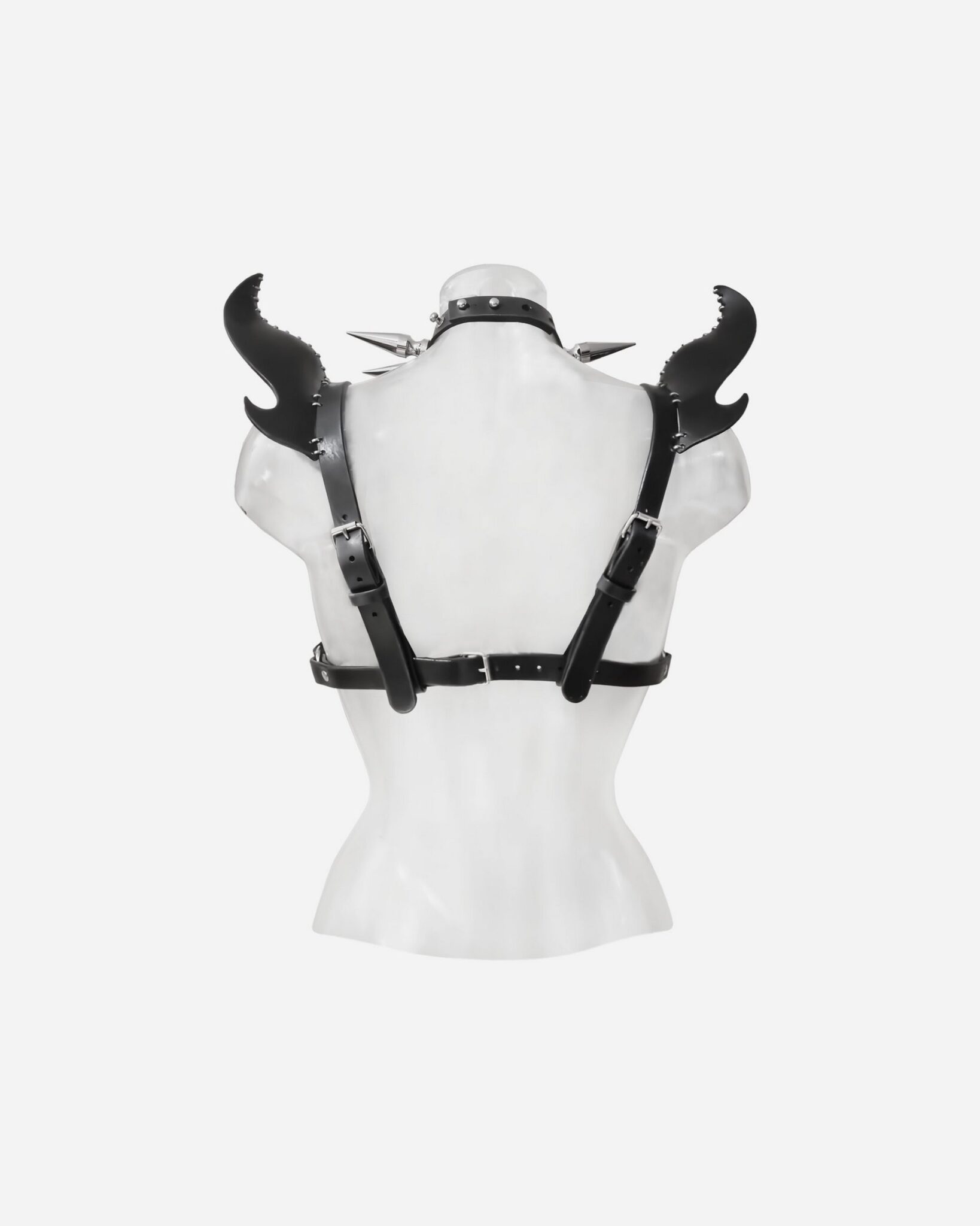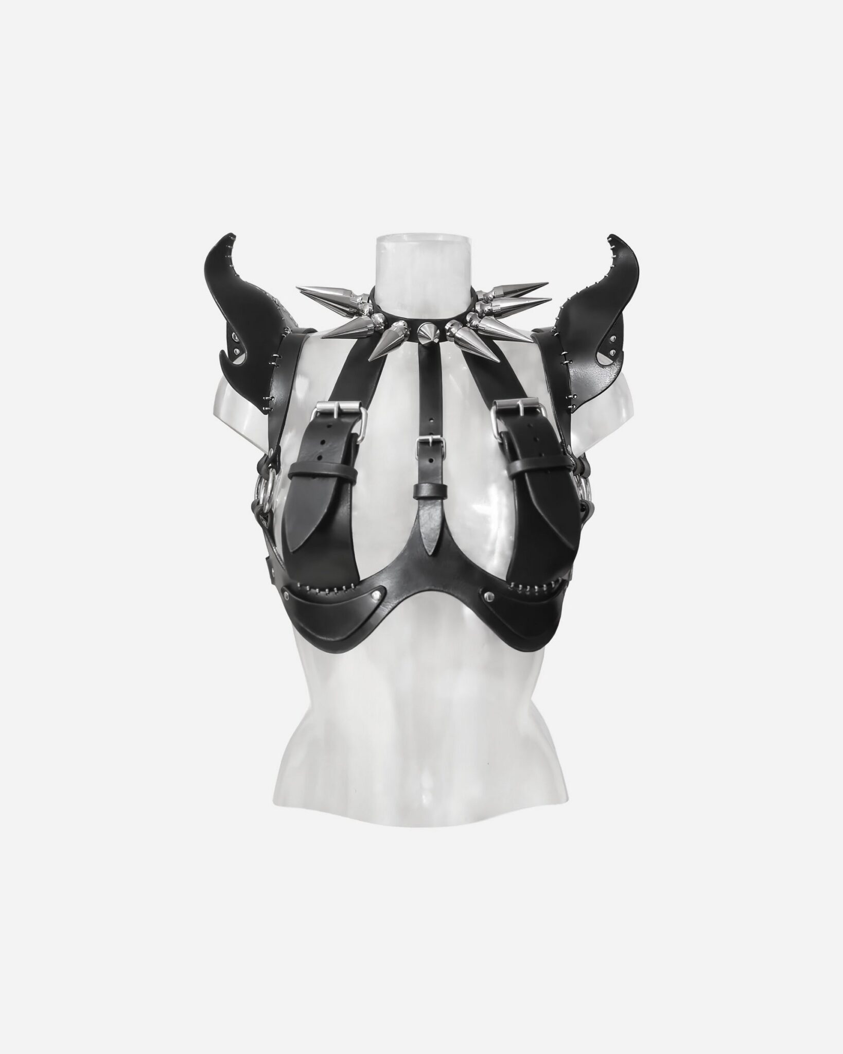 Inspired by a dark, seductive anti-heroine who haunts your dreams and commands your fears. With bold shoulder details and menacing metal spikes, this fierce leather piece wraps you in danger and allure.