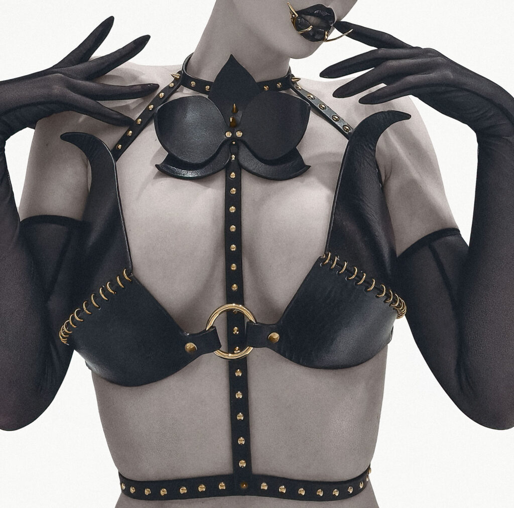 A luxurious leather bra crafted from premium materials, featuring signature metal stitching. Inspired by a captivating figure who commands with charm and mystery, this piece is a bold statement of power and presence.