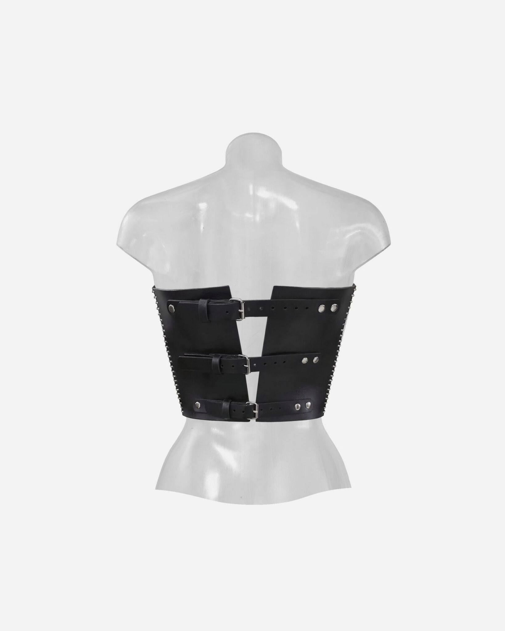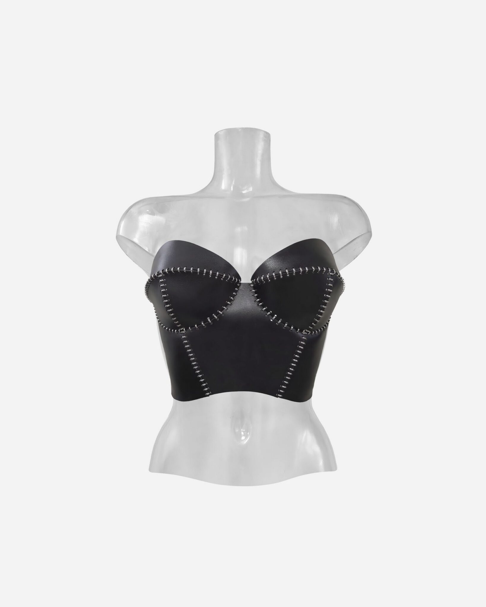 A luxurious leather bustier inspired by the enchanting yet perilous Sirin of Slavic legend. Featuring signature metal stitching, this piece captures the allure of a creature whose haunting songs led mortals to forget all and follow her into oblivion.
