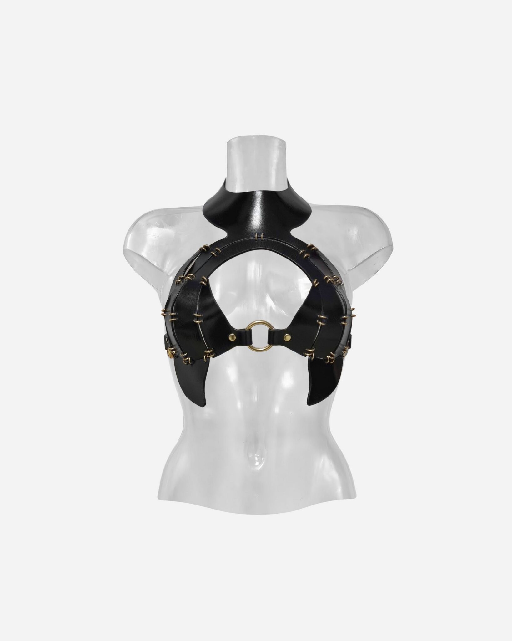 A luxurious leather bustier with signature metal stitching, inspired by a formidable force cloaked in darkness. Crafted from premium materials, this piece embodies the essence of shadow and power, fastening at the back with a bold buckle strap